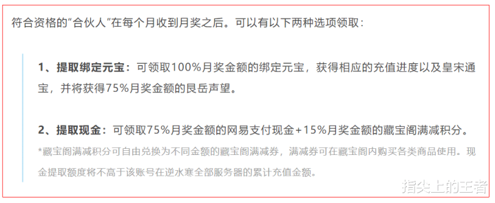 要知道《逆水寒》给予全体玩家的“分红”,可不只是单纯游戏内的货币,而是真能够提现到自己账户的现钱!根据官方介绍,每月“分红”的75%可以让网易直接支付现金,剩下的15%则可以兑换成藏宝阁满减积分。