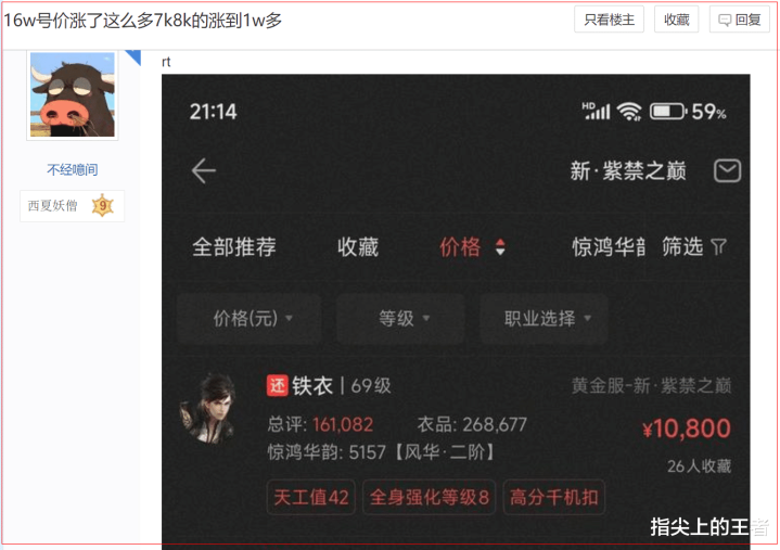 如此丰厚的回报,自然让众多围观网友眼馋不已,也正因此,近段时间《逆水寒》又迎来了一股入坑潮,直接把官方交易平台上的号价都顶高了许多。
